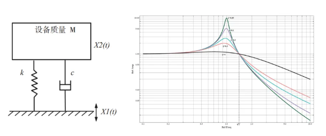 在设备与振源之间加入由弹性阻尼材料制成的减振器,以降低设备所受的振动量级是航天上常用的减振方法,其本质是一种利用弹性阻尼材料制成的振动阻尼装置,通过材料的屈服、摩擦、变形等方式将振动能量转化为其他形式的能量,从而达到衰减振动的目的。减振器的传递原理如图2所示,设计减振器时,需要根据被减振系统的特点对减振器的固有频率、阻尼和减振效率等参数进行综合设计。