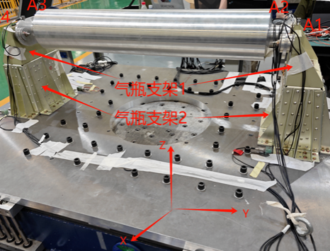 由于力箭二号增压气瓶具备重量大、尺寸大、压力高等特点,因此对其减振器设计提出了较高的要求。在设计增压气瓶减振器时,既要确保减振效率满足要求,又要避免减振器刚度过低引起气瓶管路系统在飞行过程中产生较大位移。为此,力箭二号研制团队根据振动条件、气瓶支架的传递特征以及增压气瓶及其管路系统的特点,结合数值仿真手段开展了气瓶减振器设计分析工作。为验证减振器设计的合理性,依次开展了气瓶减振器标准配重验证试验(见图3)和气瓶减振器系统验证试验(见图4),从单机到系统,逐步对气瓶减振器的传递特征进行验证。